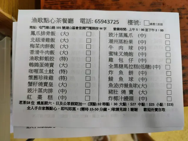 點心紙選擇廿二款,如只一人運作廚房,他的能力效率是極高的。填妥點心紙後,要自行擺在收銀處,女士說有空才能處理。價格正常,但星期六日要加收加一服務費,難道是付給我為店家服務嗎?估計是人客過多,要加價來減少需求吧。