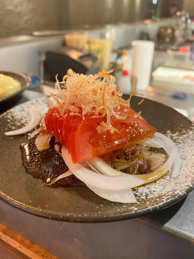 和風沙律切成薄薄的蕃茄和爽甜的洋蔥,配上和風酸汁清新開胃。