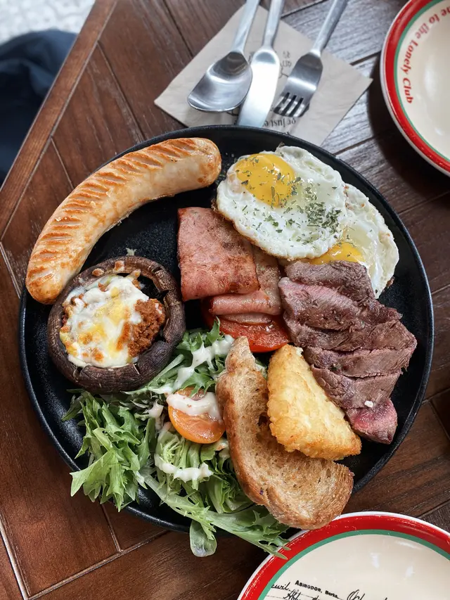 呢個份量都唔少,燒牛肉偏向得3成熟左右,但食落去唔會覺得好韌,都幾嫩口,牛味都好夠,蛋都有兩隻,薯餅幾surprise 我,因為佢薯味夠!而且口感有一粒粒!,腸仔就正常發揮,sourdough 甜甜地咁幾開胃!沙律🥗菜完全唔苦!大啡菇juicy上面有啲芝士下面就有啲肉醬,不過我個人覺得唔太夾🤣。