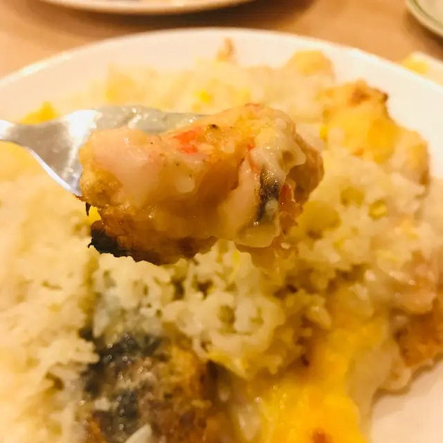 焗海鮮飯來了,佢同平時喺大家樂食的焗飯外表有啲唔同,佢係成隻玻璃碟拎入焗爐焗,初時以為佢冇焗過,但食落的確係有烤焗嘅味道,飯下面蓋着嘅係超多海鮮