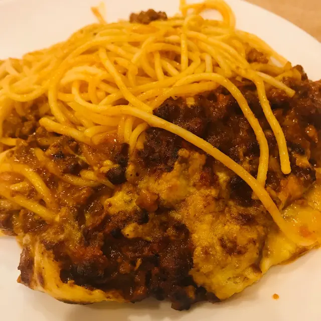 朋友點的肉醬意粉,都係用白色玻璃碟裝住,再拎去焗,他說味道很好呢
