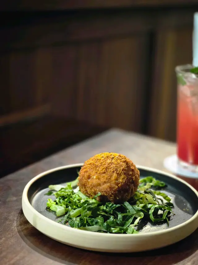 蘇格蘭炸蛋又圓又大粒,脹卜卜,賣相非常吸引!外皮香脆,入面係免治雞肉同埋流心蛋,外層加左香料調味,口感味道有層次,帶少少咸香。