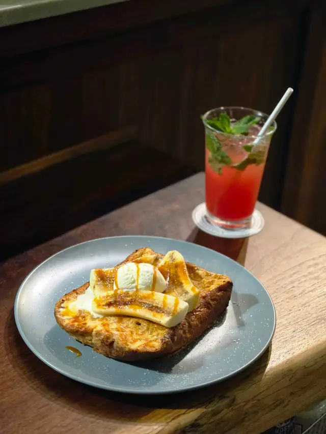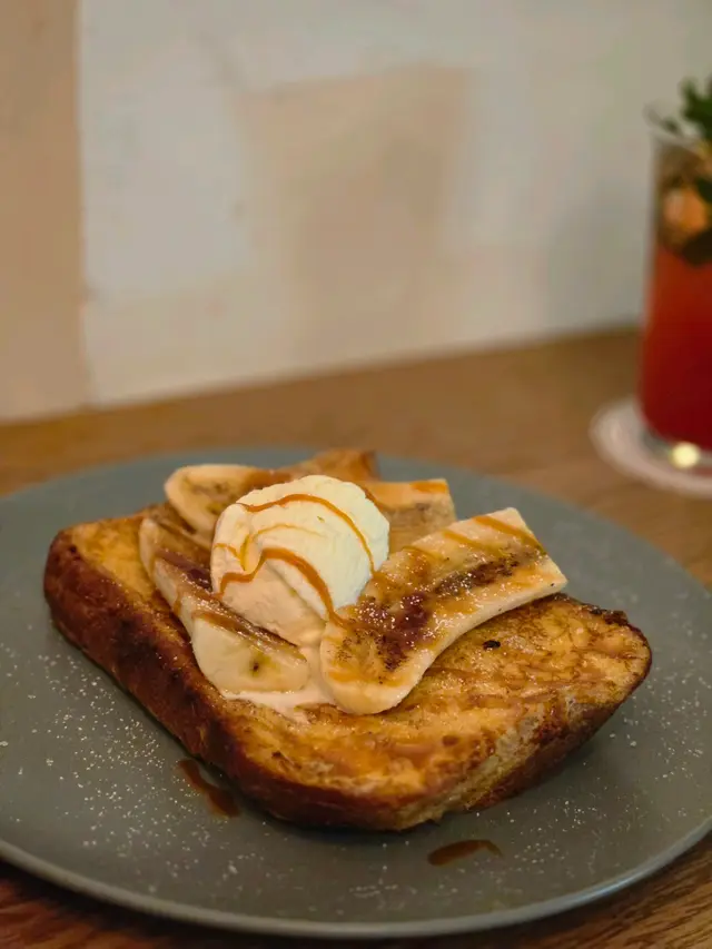 焦糖法式Toast 煎到焦香金黃色搭配海鹽焦糖醬、香脆焦糖香蕉同埋雲尼拿雪糕,一凍一熱既口感,柔軟且蛋香味濃,好好味🥹。