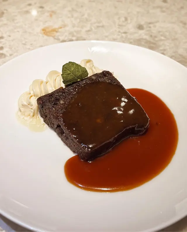 lunch set包埋甜品😋所以我地各叫左一個唔同既甜品share。聖誕布丁睇落好似一塊banana bread,食落去入面有d nuts 同提子乾,旁邊有白蘭地牛油🧈同焦糖醬🤩。頭幾啖食落好有驚喜,好full既口感,雖然同布丁扯不上關係🤣,食多幾啖開始有d濟啦,飽飽。