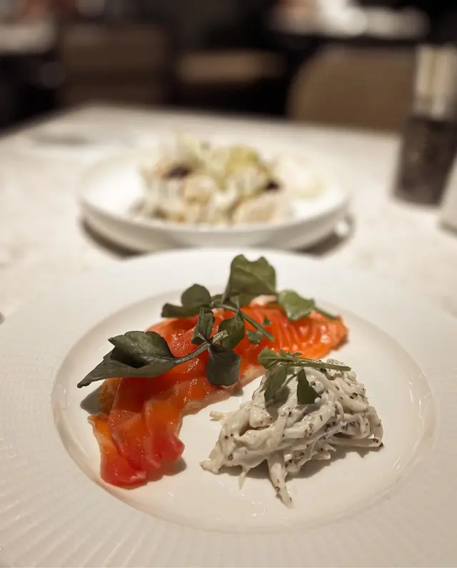前菜叫左三文魚,3片大大片煙三文魚,旁邊配西洋菜同蛋黃醬。不錯😌