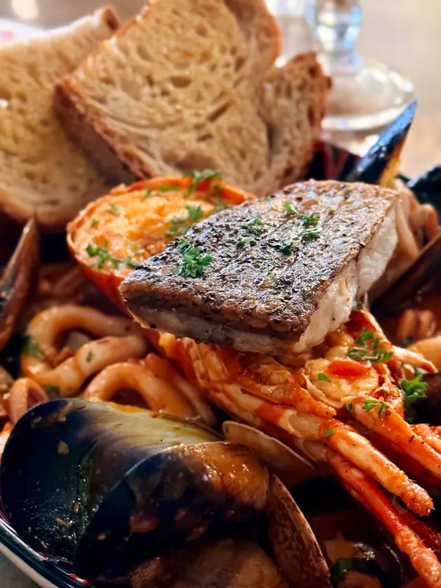 黎法國菜點都要叫馬賽魚湯🤩入面有半隻龍蝦、黑青口、大蜆、盲槽魚、魷魚🦑,好豐富,滿滿都係海鮮,龍蝦同魷魚肉質彈牙、盲槽魚夠厚肉😋湯底味道有啲似蕃茄洋蔥湯,另配烤過嘅麵包,風味十足