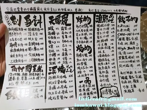 餐牌挺簡潔的一張紙過,沒有圖片,他們賣的都是日式Comfort Food,其實不用看圖片也知道是什麼東東,可以用紅色筆把食物圈出交給店員下單。當中的串燒和天婦羅,即叫即製,需要時間等候。