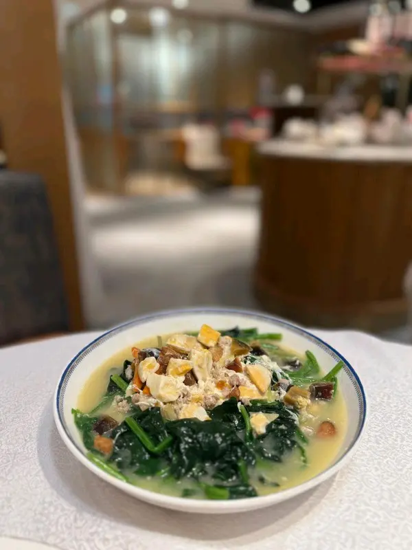 時蔬選用了新鮮菠菜,配金黃的鹹蛋黃和銀白的皮蛋,色澤鮮艷且營養豐富。蔬菜的清新口感與金銀蛋的香濃味道相互融合。
