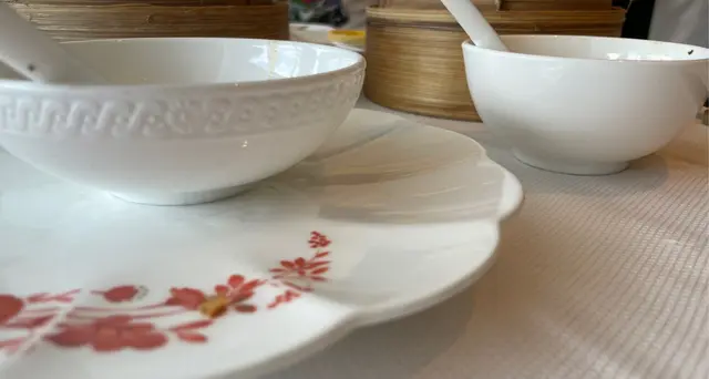 然後,牆身也很髒、枱布的繡字都甩掉線、杯碟也有點髒、筷子一用便斷了、二人的碗子也不一致,整體感覺真的很髒及殘舊。