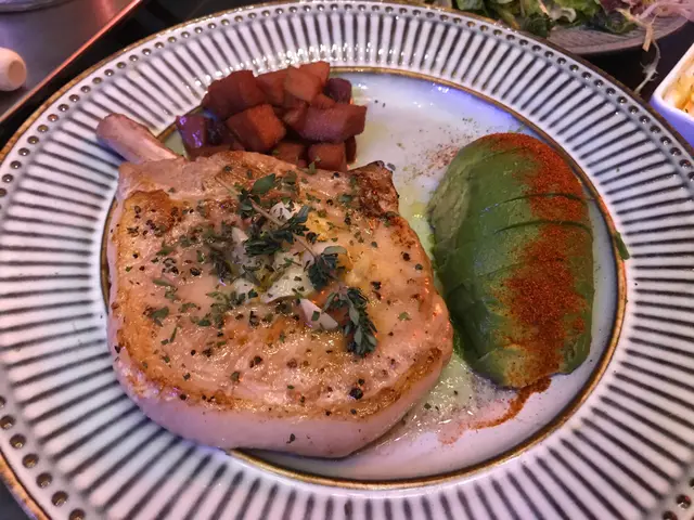法式豬鞍 加 牛油果:本身只係得豬鞍,而自己本身好鐘意食牛油果,可以選擇自由加配。表面加咗玉桂粉,配埋玉桂味嘅薯仔,好特別。