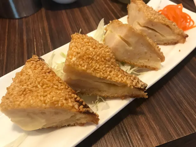 呢個法式芝心蝦多士有四件 蝦多士外層鋪滿白芝麻,炸得好香脆, 彈牙嘅蝦膠滲出半溶嘅芝士,香口得好滋味,必食的小吃!