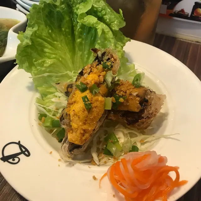 呢個算係新派嘅菜式,竟然越南春卷可以配海膽?原來又真係幾夾咖喎!春卷入面有大量粉絲同木耳, 上面有一大片新鮮海膽,一冷一熱衝擊你味蕾,多了一份鮮甜味。
