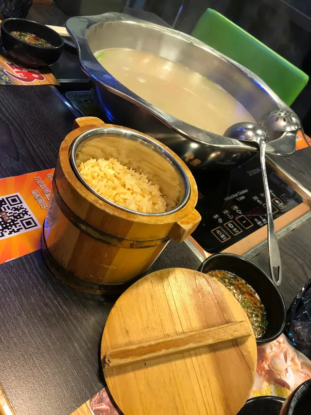 個湯底黎到,老闆就教學先飲左個滋潤湯,同埋呢個湯專誠送了一筒脆焦香飯,粒粒都脆,加上花膠湯的鮮甜味道,嘩我同老公一開始就食左大半鍋湯先落餸打邊爐,真心好舒服好好味。