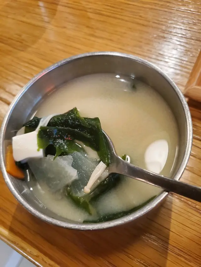 用餐時,通常會先喝少許味噌湯和麥茶。麥茶微暖的,有點麥香,正好給喉嚨滋潤一下。而味噌湯不算鹹,材料挺足夠。