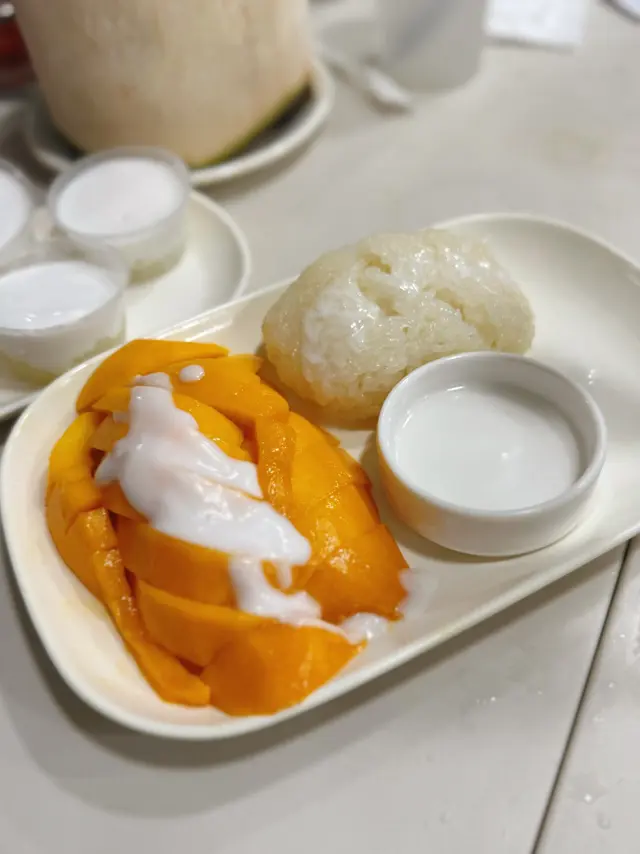泰國甜品必食「國民級」的芒果糯米飯啦!店家是用上原個芒果,果肉香甜,再配暖暖軟糯糯米和椰漿,超級大滿足