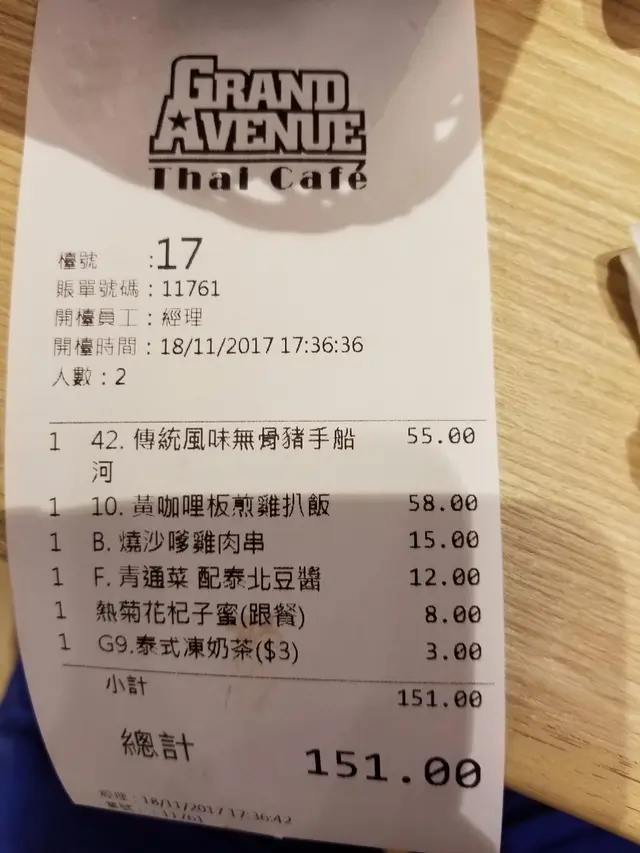 今日和太太往新港城泰巷食tea, 我們點了傳統風味無骨朱手船河, 黃咖喱板煎雞扒飯、燒沙爹雞肉串、和泰式凍奶茶。無骨朱手船河朱手肉味香濃, 鹵水汁好香, 啖啖肉好美味, 河粉湯底清甜, 好爽口;黃咖喱板煎雞扒飯黃咖喱汁辣味適中, 雞扒食落鮮嫩美味, 個人建議如果雞扒是一大塊口感會比切開一件件好d;燒沙爹雞肉串雞肉串燒得香脆, 雞肉鮮嫩彈牙, 配上沙爹汁食落惹味醒胃;青通菜配泰北豆醬通菜食落爽口新鮮, 泰北豆醬味道香濃, 辣度適中, 配上通菜好美味;泰式凍奶茶煉奶味甜度適中, 茶味香濃好奶滑口感。餐廳座位舒適, 價錢合理, 抵食美味泰式下午茶。