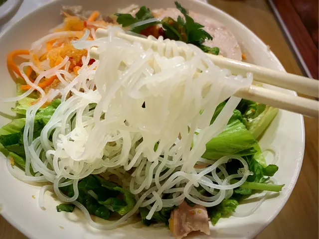 唔會太酸嘅撈檬,撈檬粉嘅質地偏向粉粉的,粉上面有麻油香味,雞絲🐥好多,有三大塊厚身扎肉🐷,仲有啲新鮮生菜🥬。