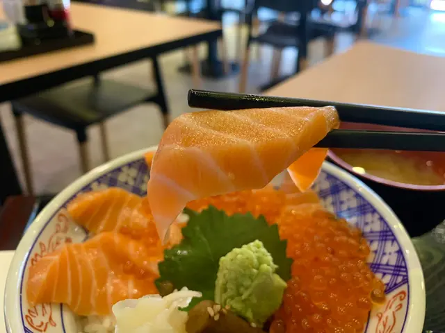 厚切三文魚大大塊鋪係米飯上面,新鮮肥美,紋理清晰。
