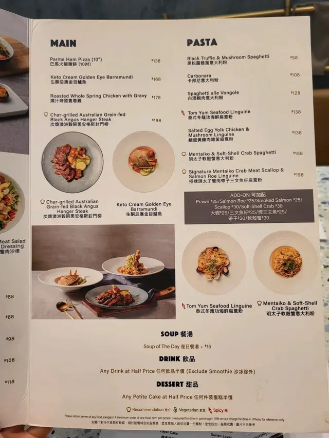 QR落單 餐牌除生酮選擇的主菜同沙律外,都有意粉Pizza等選擇。晚市跟餐蛋糕同飲品半價,十分抵食
