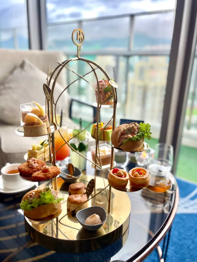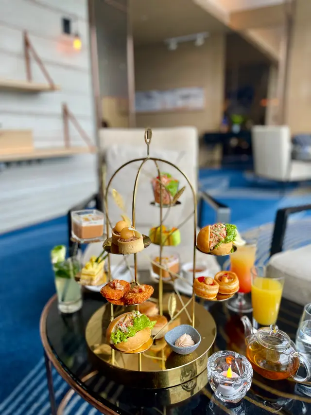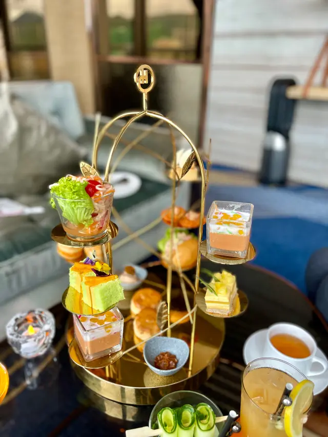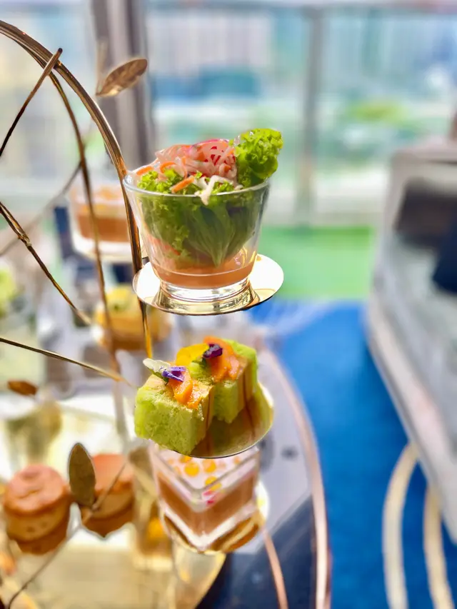 一系列富有東南亞風味嘅精緻茶點包括:迷你芒果龍蝦包、乾冬蔭帶子酥盒、菠蘿椰子慕絲榛子蛋糕與班蘭薑芒蛋糕等等