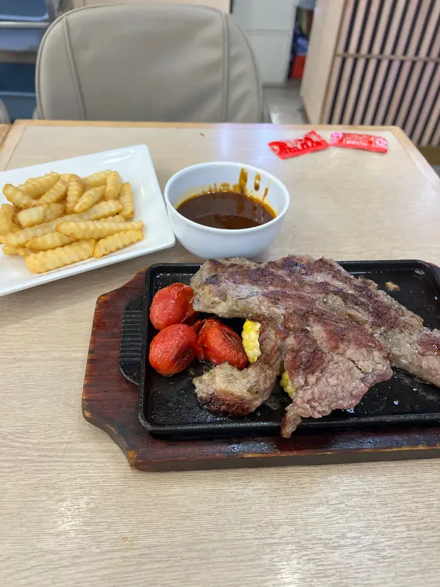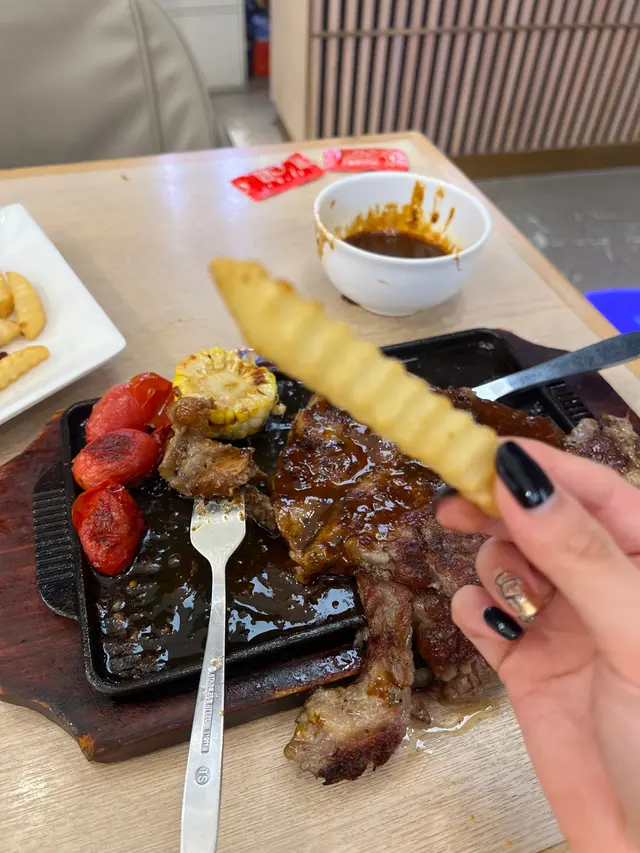牛扒厚切,鐵板滋滋熱辣上枱,煎得外焦內嫩,肉汁鎖得住,牛肉香濃郁,咬落juicy又彈牙