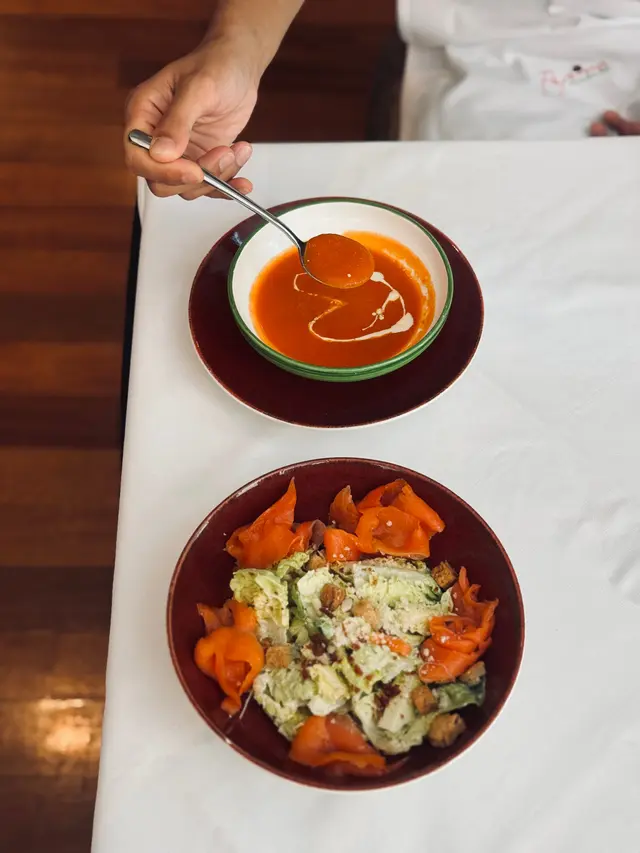 前菜三揀二🐣,煙三文魚凱撒沙律足料又繽紛🌈,材料有生菜🥬、巴馬臣芝士🧀、煙肉🐽、烤麵包粒🍞,好豐富喔;而煙燻烤蕃茄湯就好 rich 既番茄味,香噴噴煙燻味道♦️,非常暖胃🤝🏽。