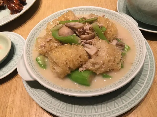 魚鰾入口即溢出濃濃的水瓜高湯,魚鰾爽口多汁,感覺有如竹笙般,但又比竹笙軟滑。