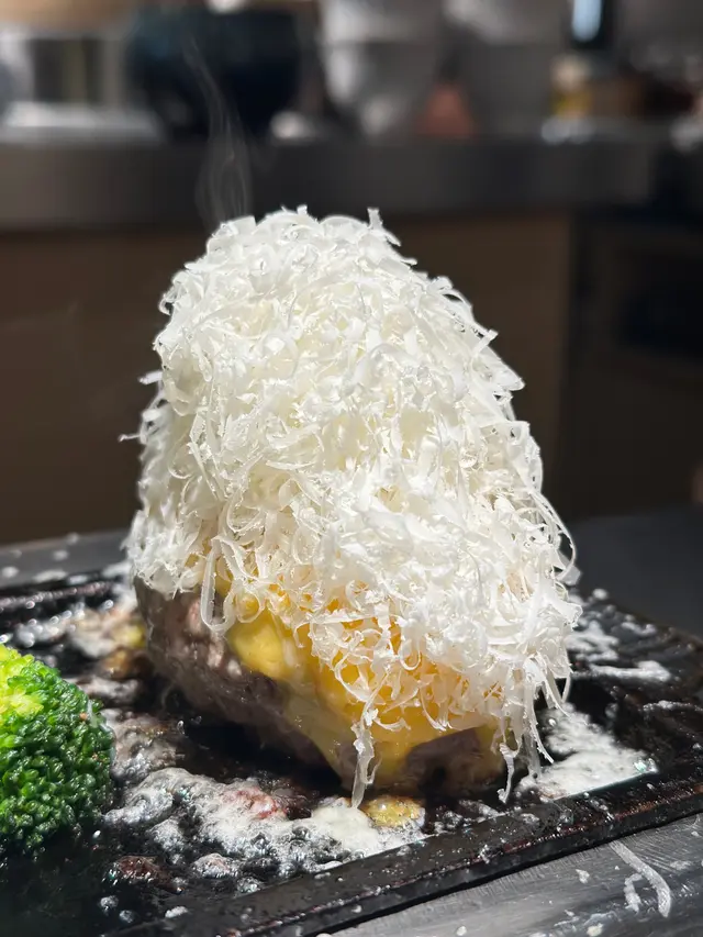 上桌前店員𥅽當面搓肉扒、煎到焦香,芝士款會先鋪一片厚芝士,再刨滿滿「芝士絲瀑布」蓋住肉扒,上桌時還在微微融化,牽絲感直接拉滿
