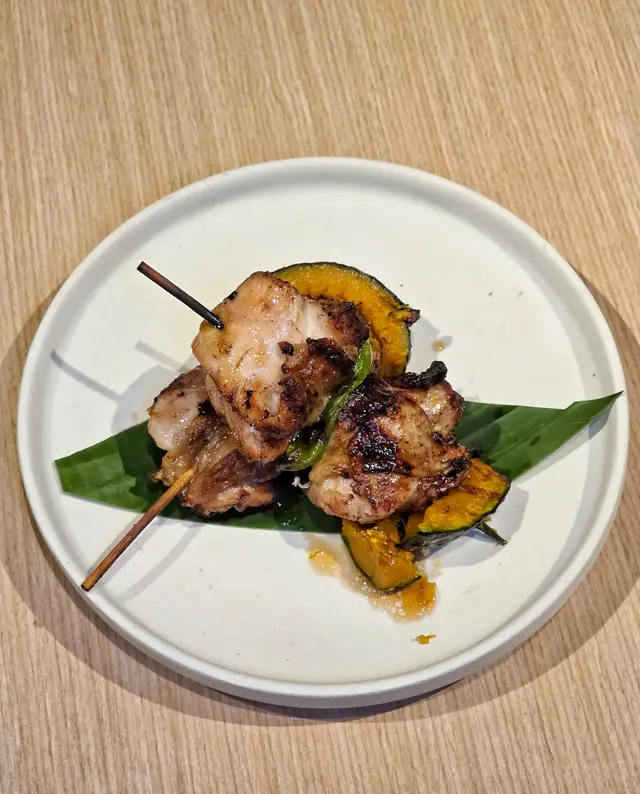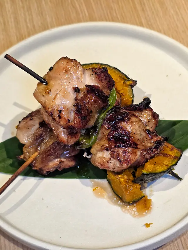 炭燒獅子唐椒、南瓜與雞肉串伴柚子醬油($68)