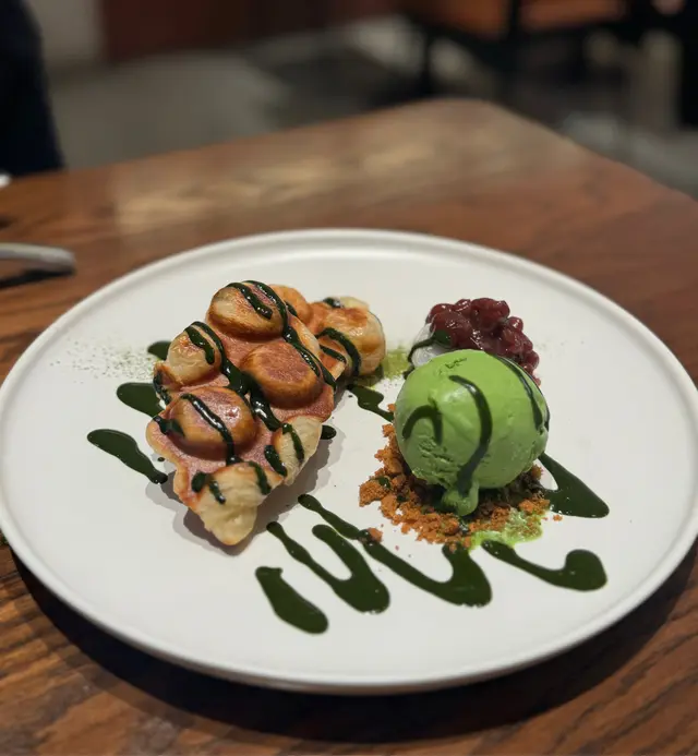 牛角窩夫外觀整得好似雞蛋仔咁幾趣緻🤭🤭,配埋濃郁抹茶醬同煙韌丸子,口感豐富,同朋友share一人一塊啱啱好👍🏻