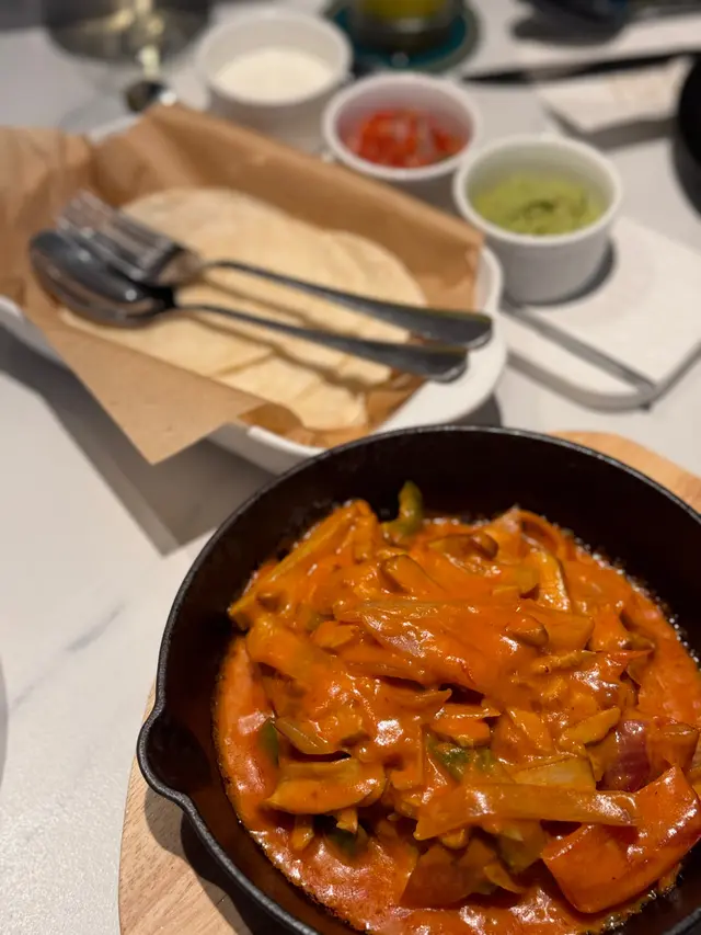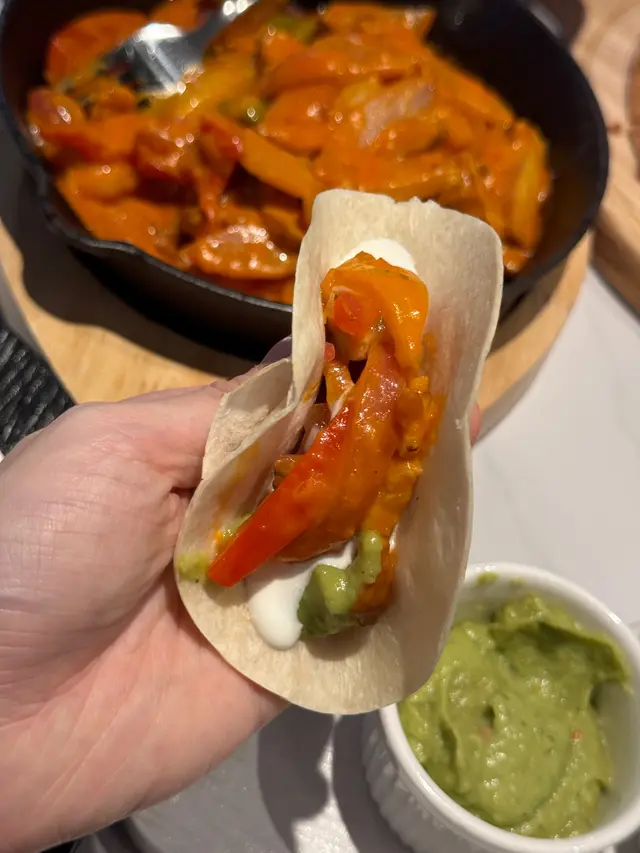 用熱辣辣嘅鐵板裝住雞肉炒洋蔥同3色甜椒再配熱玉米餅比你自己夾,另外主角就係嗰三個醬料,牛油果醬,莎莎醬同酸忌廉,自己鍾意將三個醬都撈埋一齊一啖過咁就最滿足