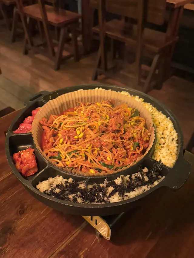 份量超足,一份可以三至四個人share!用韓式秘制辣醬炒豆芽、泡菜、豬肉,豬肉嫩滑入味,超餸飯🍚。另外嗌咗生菜🥬,用生菜包住食都幾味~