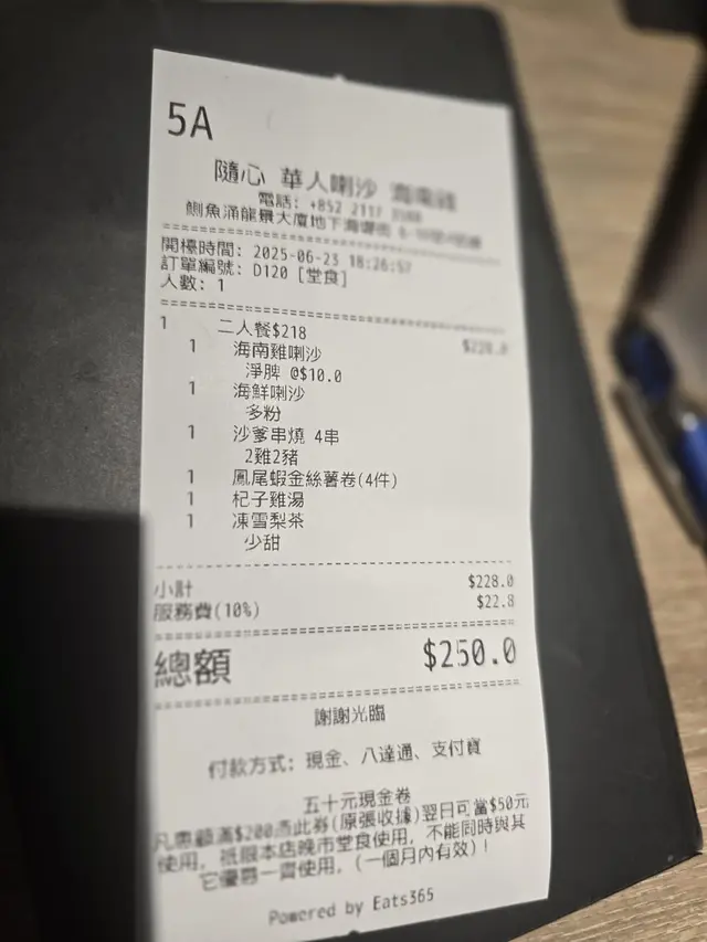 值得一讚的是搭配的雞湯(飲品),清澈鮮甜,作為佐餐飲品非常合適,能中和菜式的濃味,是貼心的選擇。整體而言,雖然喇沙湯底可更濃、部份菜式份量偏少,但菜餚的烹調水準和風味呈現仍屬不錯,尤其招牌的鳳尾蝦金絲薯卷確實出色。
