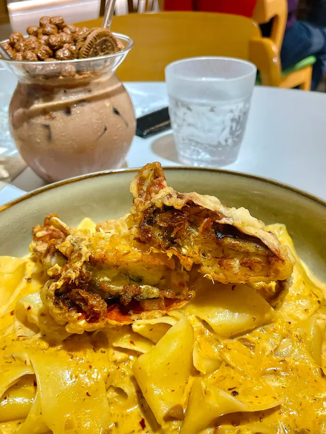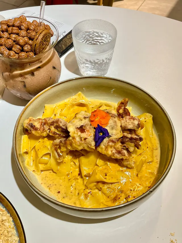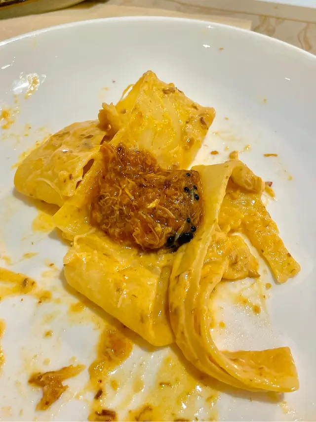 軟殼蟹辣椒蟹忌廉醬義大利蛋麵(單點$208),表面鋪有食用花,軟殼蟹口感酥脆,味道鮮甜,闊蛋麵容易掛汁,配以辣椒蟹忌廉醬食用,口感Creamy,味道微辣,建議配搭另一道菜式的辣椒蟹肉醬一同食用。