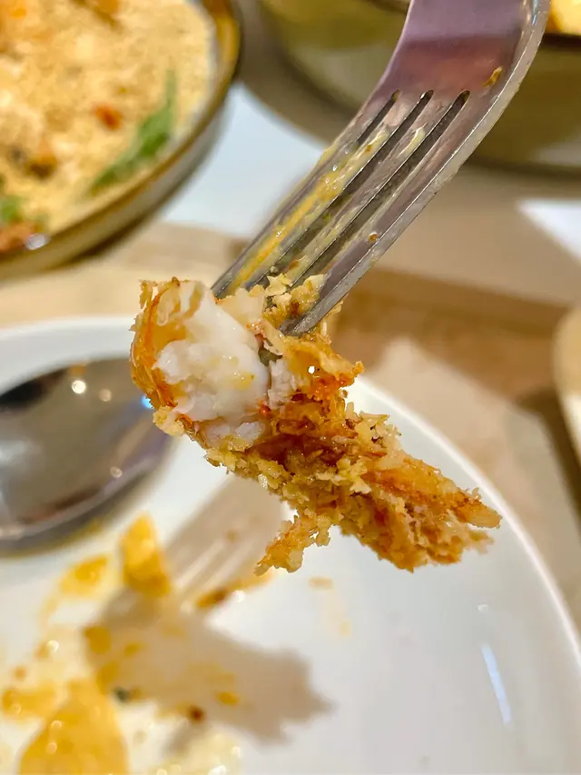 奶油麥片軟殼蝦(單點$188),老虎蝦好大隻,即叫即炸,炸得非常透徹,令蝦殼都炸得十分香脆而可以食用,蝦肉肉質爽口,味道鮮甜;老虎蝦表面裹滿麥片,由於麥片混合了奶粉、奶油拌炒,整體食落多了一股奶粉的甜味、奶香味,亦帶有麥片的顆粒感,雙重脆感,配料包括有指天椒、咖喱葉。