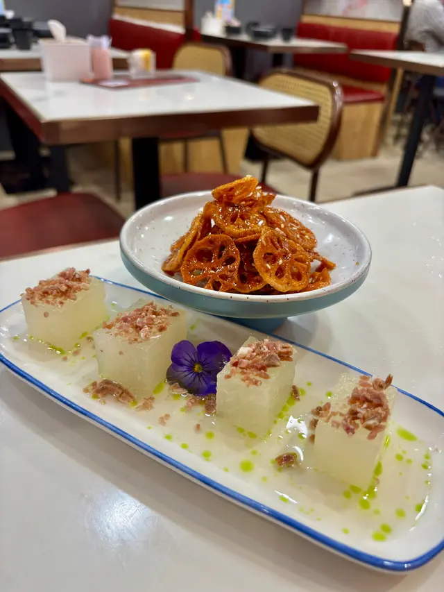 薄切蜜煎蓮藕片,外層微脆,帶甜中又有微辣,口感輕盈,好吃又唔膩。