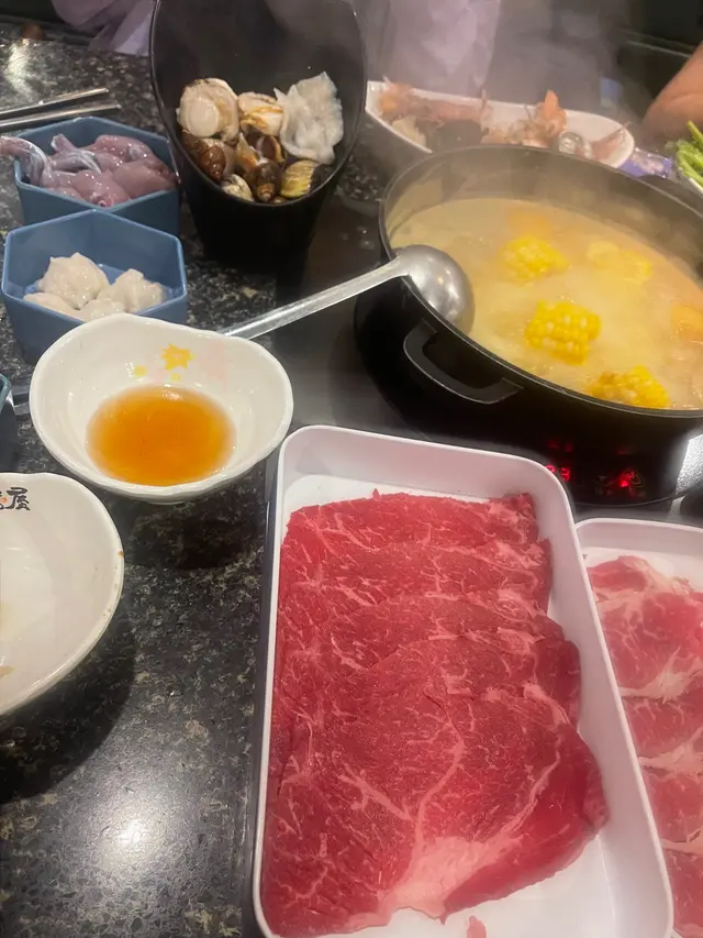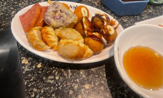 雞煲的雞是任吃的,我們點了BB辣,不辣但有少少麻,吃完可轉鍋底我們選了豬骨湯底,不知道為什麼有超多翡翠苗成個鍋都是這個味😅點了些牛、醉雞件、田雞腿有陣腥味👎🏻帆立貝、東風螺、黃貝、鱔片、手打墨魚丸這個不好吃超多粉👎🏻章魚小丸子裏面得很細粒的章魚這個麻麻,金菇肥牛好吃👍🏻,燒多春魚不錯,焦糖菠蘿只燒了菠蘿上面的砂糖,如果可以燒埋菠蘿就正,朋友形容上面的焦糖像吃玻璃😂飲品櫃有韓國啤、韓國真露在啤酒後面比較入,樽裝水、樽裝檸檬茶、罐裝汽水、罐裝龍井之後轉了烏龍茶等、