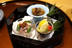 打頭陣喺前菜3點,分別有新鮮水茄子、北海道魷魚配秋葵、赤水母,食嘅次序都喺跟呢個,由淡至濃,外觀就非常之精緻靚仔,貫徹日本菜一向亮麗嘅賣相。新鮮水茄子口感清爽,中間夾住一片板栗甘露煮,顯示得寧舍香甜;魷魚口感彈牙,上面嘅豉油脆脆喺豉油、炸蒜、芝麻混和,令味道更豐富;赤水母做成醋物,底下佐以青瓜絲,酸香醒胃,口感爽滑。