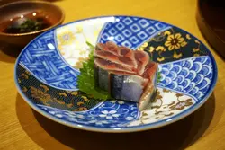 小弟試嘅喺另一款刺身,平靜魚以蘋果木煙燻過,入口有陣陣煙燻香,而肉質帶點爽口感,亦可以以紫葉葉捲住一齊食,別具風味。