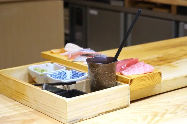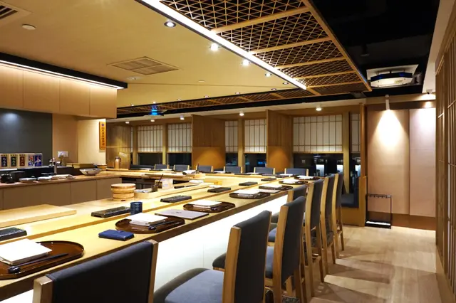 有別一般食廈樓層,一出電梯就喺餐廳,餐廳入口明顯專登縮咗入去,增加整體私隱度。而踏入用餐區,以一貫和風淺木色為主,裝修簡約,配以柔和燈光,感覺舒服。一張L形板前席,目測所見,大概有14個位,喺食「廚師發辦」嘅指定最佳位置,因為可以睇到師傅切魚生嘅刀功、揑壽司嘅手勢,又可以跟師傅交流。另一邊挨窗嘅喺4人座嘅卡位,最欣賞喺以大屏風前後隔住。