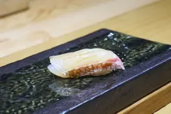 師傅話喺心機菜,因為要以昆布包住蒸6小時,先做到軟腍彈牙,佢更捧出一大盆黑鮑魚,話好受食客鍾意。而作為刺身,更佐以自家製鮑魚肝醬,並配一口白飯。的確,件鮑魚軟腍好有咬口,肝醬濃香甘腴,所以,就用埋啲飯嚟沾上剩餘嘅肝醬,一啲都唔好嘥。