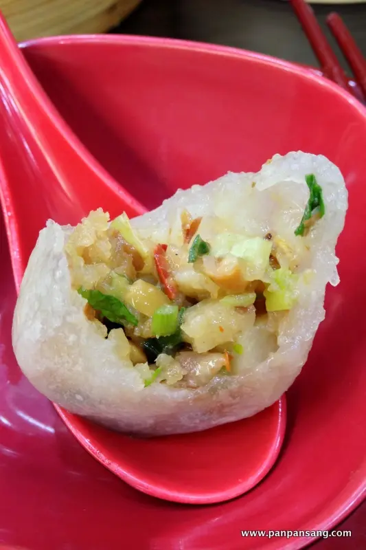 這裡的一籠三大隻,飽滿豐富的材料除了一貫的花生,肉末,粉葛之外,更加入大量韮菜提升香味,入口帶辛並更加爽脆,彌補了厚皮的不足,也是美味推薦之一.