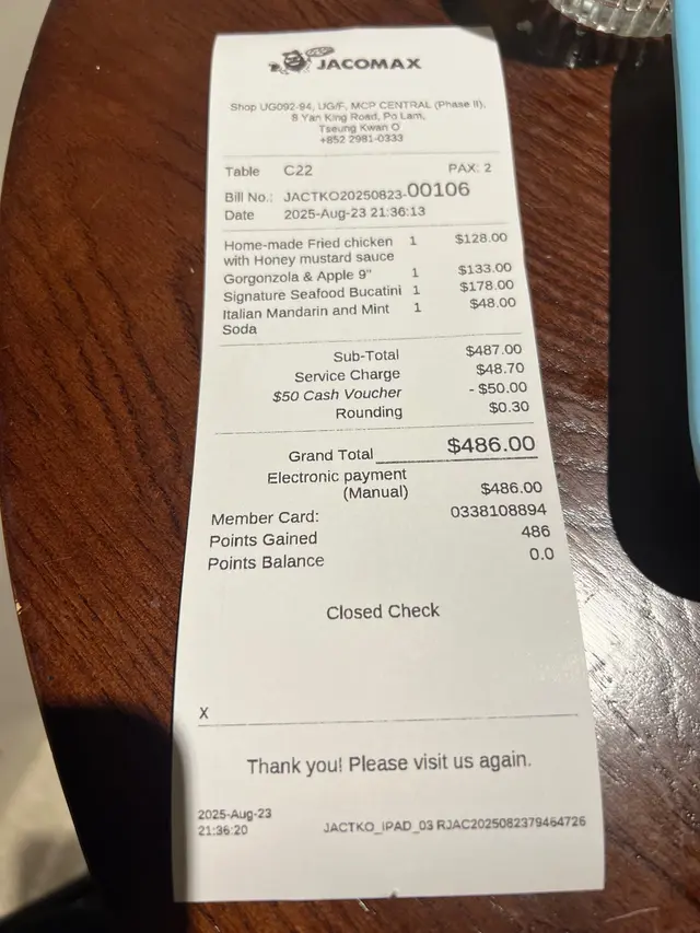 最值得去既香港餐廳 香港真實食評等级22025-08-232K 瀏覽 關注 (1)員工服務非常十分之有禮貌、因為第一次去所以由員工推介菜式、會了解客人喜好、真係好細心介紹最受歡迎既食物、而用餐過程都感受到餐廳既員工都好有熱誠同有禮貌、絕對不是做作生硬程序式的服務好值得稱讚(2)Gorgonzola & Apple 9"、食過最好味嘅藍芝士pizza、好香、蘋果甜甜地好好味呀、如果鍾意藍芝士嘅愛好者一定喜歡。(3)炸雞外脆內嫩滑(4)Signature Seafood Bucatini一個非常出色嘅海鮮意粉、少少辣味提起全個意粉嘅鮮味是一間非常難得「食物質素好」「餐廳服務質素都很良好」「支持香港經濟」「支持香港飲食」香港餐廳都應該學習這一間餐廳質素。香。脆。內嫩滑。Gorgonzola & Apple 9"Signature Seafood Bucatini4以上食評乃用戶個人意見 , 並不代表OpenRice之觀點。讚好分享最值得去既香港餐廳 JACOMAX https://s.openrice.com/QrLT0K1DU00檢舉 張貼 評分5味道5環境5服務5衛生5抵食推介美食Home-made Fried chicken with Honey mustard sauceGorgonzola & Apple 9"Signature Seafood Bucatini用餐日期2025-08-23用餐途徑堂食人均消費$200 (晚餐)