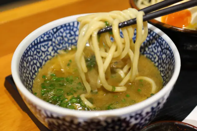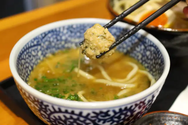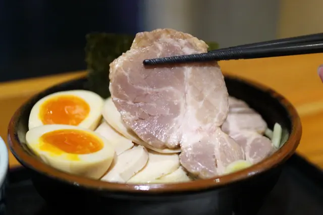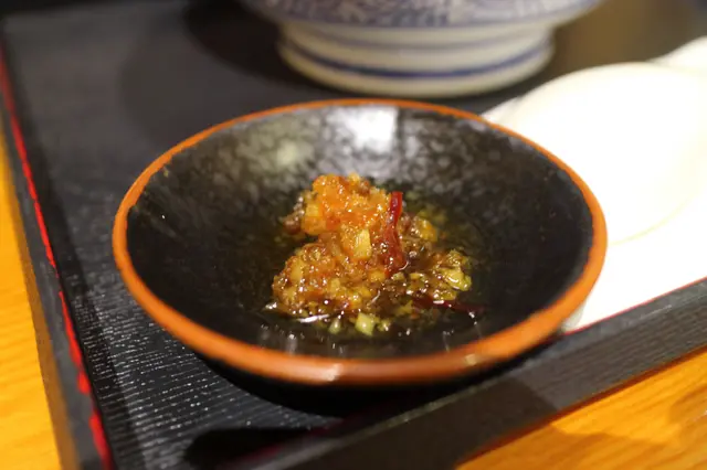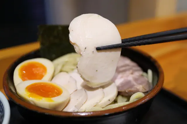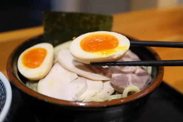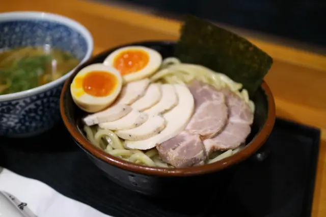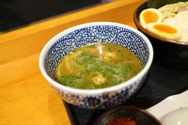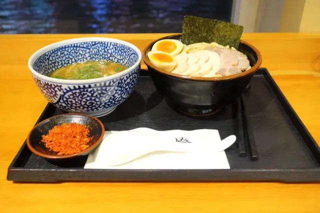 端上的時候,濃厚豐盛的魚介湯底撲面而來。附設一小碟的辣椒粉及櫻花蝦粉作調味粉。沾麵麵底是用上傳統的蛋黃直麵,掛湯力強,粗身煙韌。魚介湯底濃厚稠口,雞香鮮香,原來是用上油雞高湯,再配上五種魚介及獨門醬汁調製而成。湯底掛湯力強,黏度甚高,撒上細碎的蔥花作 點綴調味外。湯底中有兩粒雞肉丸裏混入了紫蘇葉和雞軟骨碎粒,入口軟嫩芳香,雞軟骨嚼勁脆口。溏心蛋蛋白嫩滑,蛋黃味香濃郁,稠密緻滑。叉燒薄身清嫰,香韌嫩熟,肉香中更帶煙薰香。雞叉燒雪白嫩滑,肉味恰到好處。