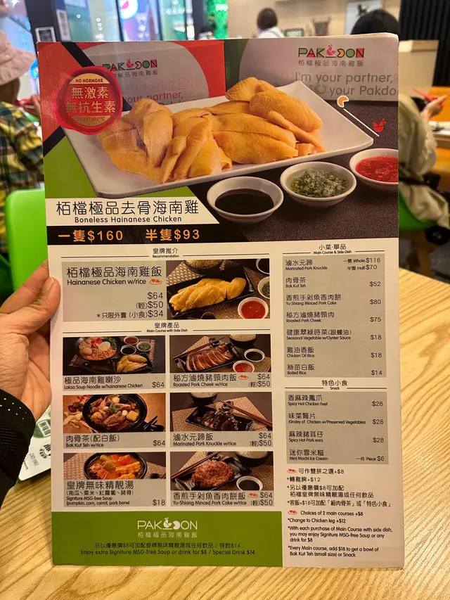 係荃新天地一期地下,Foodcourt 旁邊,栢檔極品海南雞飯就係大家樂對面。第一眼就被佢嘅海南雞吸引住,無骨、無味精、係廚房外邊已經睇到滑溜。我同朋友就order 左一份海南雞飯、魚餅米粉以及肉骨茶。
