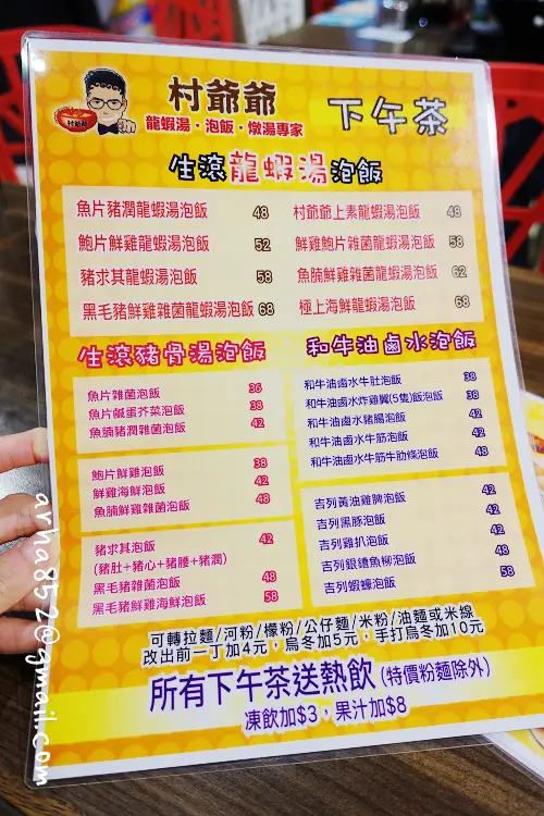 晌油麻地砵蘭街嘅村爺爺,同一條街有三間唔同名嘅分店,主打食物各有不同,呢次試咗龍蝦湯泡飯做主打嗰間。