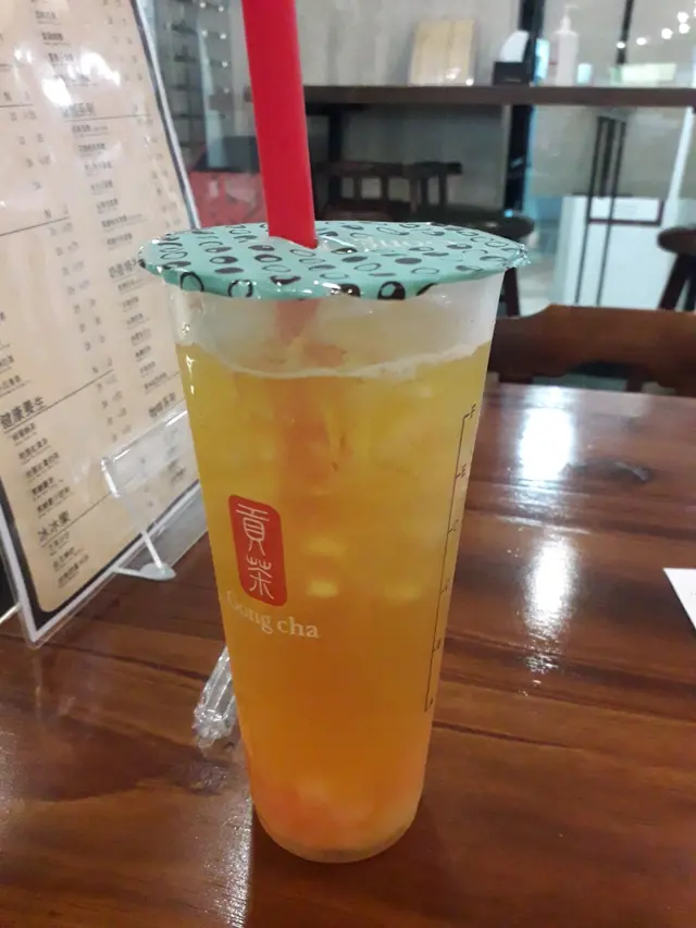 我沒有刻意要求「貢茶」,為「甜星水蜜桃果茶」飲品實際甜度「減甜」,所以「貢茶」製造出來的「甜星水蜜桃果茶」實際味道很甜,糖漿甜味足以掩蓋「綠茶」茶底裡面的微甘味道。