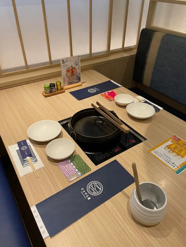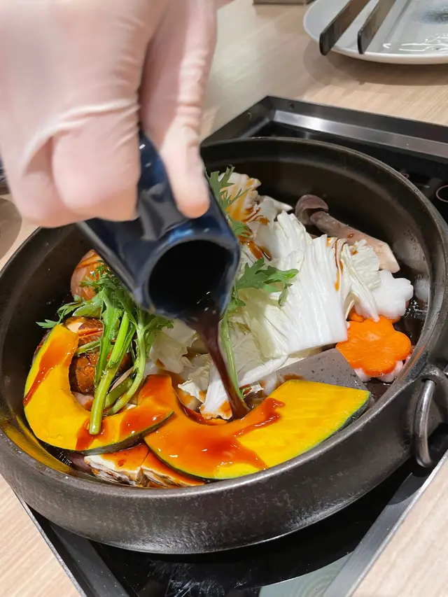 湯底係壽喜燒及鰹魚湯底混合,將蔬菜及烏冬放入鍋煮