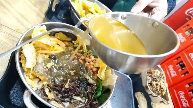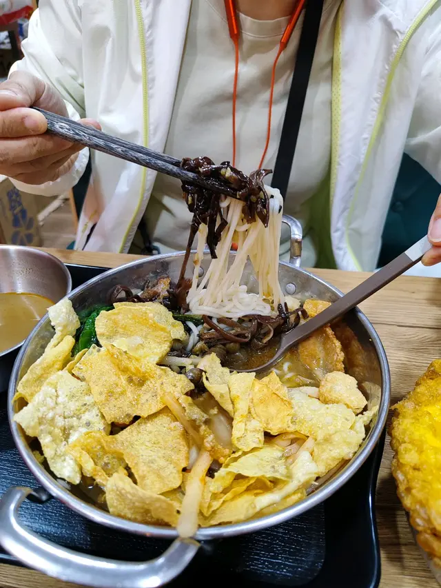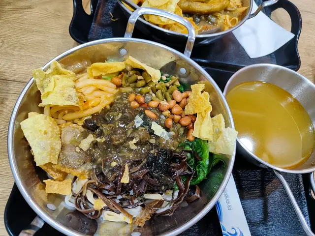 都係用小鐵盤上,見到螺絲粉上面鋪有秘製炒螺醬、炸花生、香辣酸筍、酸豆角、木耳絲、炸鍋肉、爆炒田螺, 仲配有一碗湯汁。 建議大家先撈一撈,首先食一啖螺醬嘅鮮,再加湯汁。呢個食法都幾新鮮 🌞