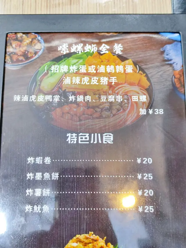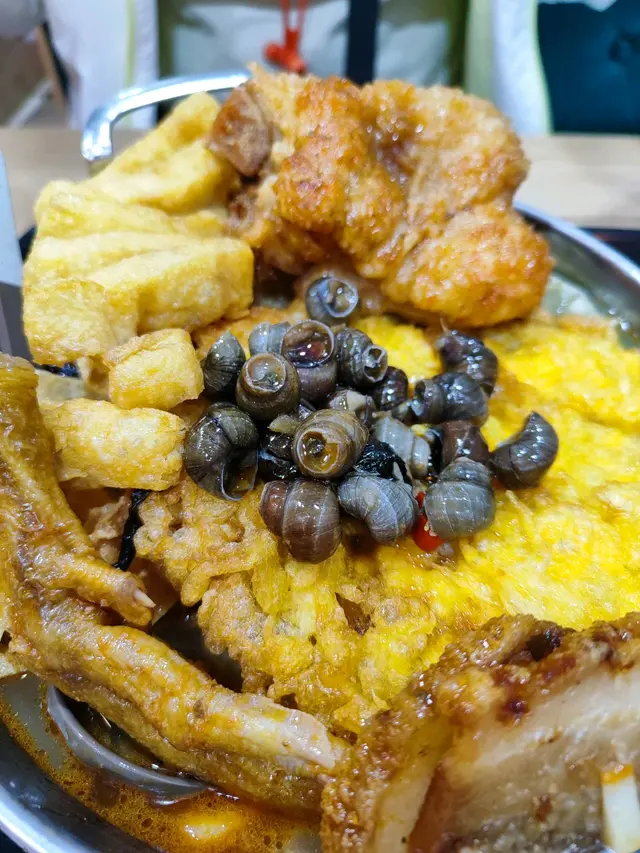 螺絲粉以小鐵盤上,並伴以香辣酸筍、炸花生、炸支竹、酸豆角、木耳絲、炸鍋肉、爆炒田螺、蔬菜我選通菜。滿滿的一盤,非常材料豐富,再加上螺絲螄全餐的🌸招牌炸蛋🌸或、 鹵辣虎皮🐖豬手、辣滷虎皮🦆鴨掌、炸鍋肉、豆腐串、田螺。堆到成個小山咁,視覺上已經滿足。先食一啖粉, 小小辣再加清甜嘅湯底層次豐富,鮮筍加上螺,味道一流。